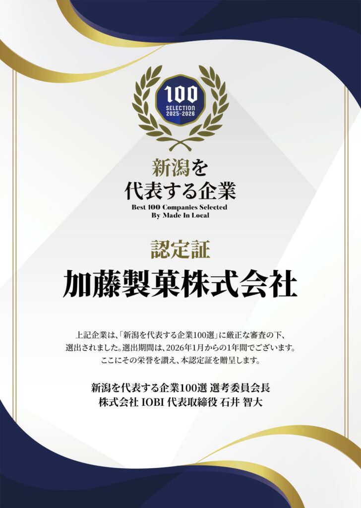 MEDE IN LOCAL という言葉をご存じでしょうか。 地域から本気で日本を変えたい。 日本には400万社以上の企業が存在しているとの事だが、日本経済を成長させていきたのは、数少ない大企業と、それらを支えてきた地域の企業。 日本の宝である、地域の企業に光をあてないといけない。 地域の企業が元気になれば、必ず世界と戦える日本が戻ってくる。 持続可能な社会を作るためには、今までのやり方ではだめになる。 地域の企業から意識を変えていき、日本を変えていく。 そこでまずは、全国47都道府県・合計4700社の”地域を代表する企業”を誕生させる。 それは、名実ともに地域を代表するような企業でなくても良い。これから地域をより良くしようと努力している企業も対象としている。 大事なのは、自分たちが「地域を代表する企業100選」にふさわしい企業になる努力をしているかどうか。 そんな理念を持つ「MEDE IN LOCAL」の新潟県を代表する企業100選に「加藤製菓株式会社」が選ばれました。